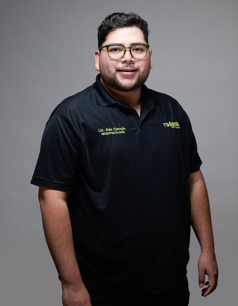 Lic. Alan Carreón es Licenciado en Psicología y Neurociencias, y actualmente es pasante de la Maestría en Educación Inclusiva. Cuenta con diversos diplomados y participación constante en congresos de Neuropsicología, así como formación en Logopedia, Lenguaje y Comunicación Aumentativa y Alternativa.